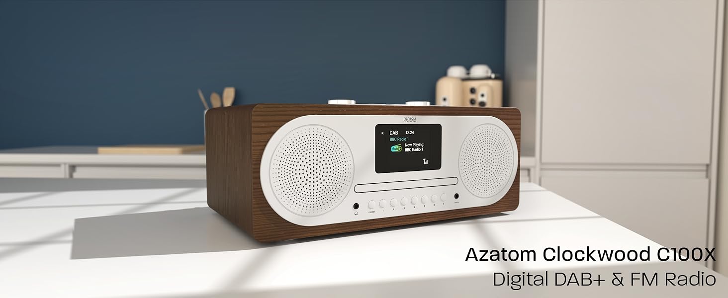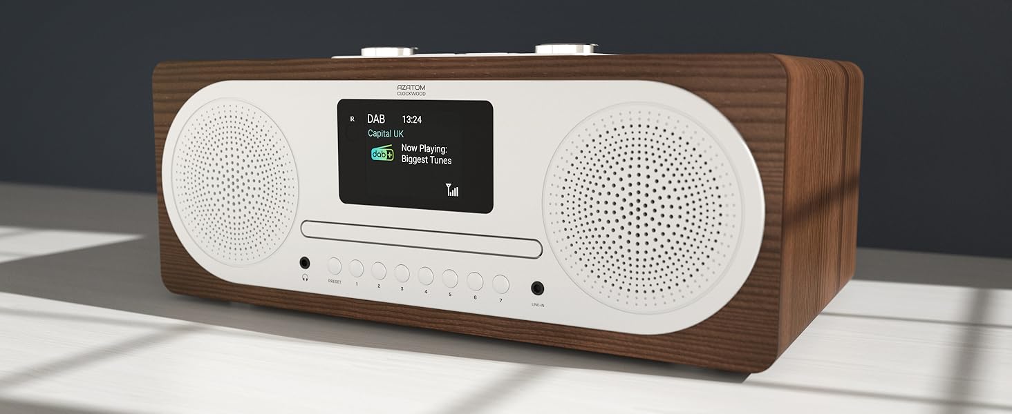 The Azatom Clockwood is a British-designed premium digital radio featuring advanced DAB+/FM reception, versatile CD and Bluetooth playback, and a fast USB charging port. Engineered for superior sound quality and backed by a 3-year extended warranty, it’s the perfect stylish audio centerpiece for home or office.